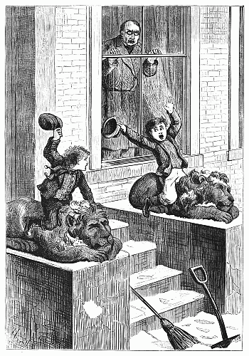 The boys jumped down, and began to ply their broom and shovel with great vigor. But Murphy looked up roguishly, and said, “We were just polishing off the lions, sir.”